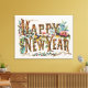 Illustration vintage Happy New Year holiday design initialement publié par Currier & Ives en 1876 avec les mots "Happy New Year" écrits dans des branches d'arbres et décorés de saints, de glands et de fleurs célébrant toutes les saisons de l'année.