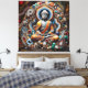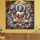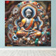 L'image montre une statue de Bouddha finement conçue avec une variété de géodes et de pierres précieuses colorées. Le Bouddha est représenté dans une posture méditative, les mains reposant sur les genoux et les jambes croisées. La statue est ornée de pierres multicolores vibrantes, dont des tranches d'agate, des géodes et d'autres minéraux, créant un décor visuellement étonnant et élaboré.