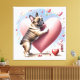 Bouledogue français sautant droit hors d'un grand cœur. De nombreux cœurs colorés, un superbe cadeau et un bulldog adorable. Le bouledogue français est un petit molosse très agile, sportif et éveillé. Le bouledogue français est un clown parmi les races de chiens et extrêmement attachant. Le bulldog est très aimé des enfants et un chien de famille fidèle. En raison de sa taille, il est également facile à vivre en appartement, bien sûr, il aime sa promenade régulière.