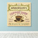 Cette décoration murale en toile enveloppée sur le thème du café conviendra à tous ceux qui tiennent leur propre café ou ont un thème café dans leur décor de cuisine maison. Réalisée dans des tons de brun rétro, vert, violet et d'orange, cette conception inspirée d'espresso / cappuccino comprend une tasse sur une soucoupe, deux bannières texte personnalisées et les mots "Café Shop / Roast frais / Grande Saveur" en violet. La tasse est bouillante et la bannière supérieure a des tourbillons qui imitent la fumée. Le tout repose sur un arrière - plan beige clair café-haricot-motif. Utilisez les modèles pour ajouter facilement votre nom. Vous pouvez également modifier le bas de la page si vous le souhaitez, qui se lit actuellement : "Aucun motif de plainte". Si vous devez redimensionner le texte pour l'adapter, cliquez sur "Customiser". Si vous décidez de choisir une forme de toile qui n'est pas carré, vous pouvez également sélectionner des éléments de conception sous "Customiser" et les redimensionner pour mieux adapter votre forme de toile. Prenez une tasse de Joe et admirez vos propres peintures murales personnalisées.
