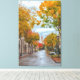 Vue sur la rue à l'Université de Stanford en automne. La route est humide, reflétant le ciel et les arbres environnants. Les arbres bordent les deux côtés de la rue, affichant des couleurs chatoyantes en automne, jaune, orange et rouge. Au loin, on aperçoit la tour Hoover au toit rouge. Le ciel est couvert, créant une lumière douce et diffuse.