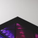 Un design numérique en vitrail de style Art déco, populaire au XXe siècle. Le motif de l'éclatement de soleil, largement utilisé, est central, s'élevant derrière un paysage vert équilibré par un arbre d'un côté et des nuages et des fleurs de l'autre. Les formes géométriques sont utilisées pour souligner la symétrie de la scène, avec l'arbre et les nuages faits de cercles qui se chevauchent. Diverses fractales aux couleurs vives donnent la texture et l'intérêt du "verre". La scène est encadrée de ferronnerie noire et de blocs en forme de losange dépoli avec des motifs fractaux foncés mais vives.