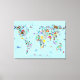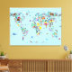 Une carte du monde avec des animaux de dessins animés, des monuments célèbres et des bâtiments. Une carte colorée, amusante et passionnante pour n'importe quel jeune enfant afin d'attirer son imagination. Arrière - plan bleu clair.