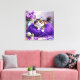 A wall art with a sweet kitty cat sitting on a ball of purple yarn and next to a purple vase of flowers.