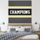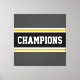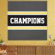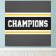 Ce design sportif et coloré présente du texte athlétique CHAMPIONS à l'intérieur d'une large bande horizontale de course au centre avec des rayures jaunes et blanches dorées adjacentes contre des rayures extérieures gris foncé. Les couleurs et le texte de ce design peuvent être personnalisés.