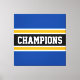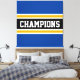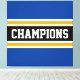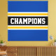 Ce design sportif et coloré présente du texte en CHAMPIONS athlétique à l'intérieur d'une large bande horizontale de course centrale noire avec des rayures jaunes et blanches adjacentes contre des rayures extérieures bleues et profondes. Les couleurs et le texte de ce design peuvent être personnalisés.
