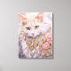 Impression de toile avec une belle illustration. Un chat blanc aux cheveux longs qui a l'air royal et élégant. Entouré de fleurs roses, de bijoux en or et en diamant.