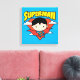 Regardez Chibi Superman voler dans les nuages avec son nom de super héros au-dessus et sa forme de bouclier à pois rouge derrière lui.