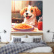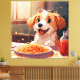 Un Chien blanc, taché de taches brunes, plonge d'abord dans une montagne de spaghettis. La sauce tomate éclabouille sa fourrure et la nappe blanche dans un délicieux gâchis. Rendu dans une composition étonnante et magistralement équilibrée (pensez au ratio d'or !), l'illustration évoque le détail, mais capricieux