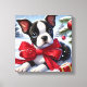 Un mignon chiot de Boston Terrier portant un arc rouge sous une chute de neige à côté des décorations de vacances