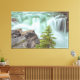 L'image montre les chutes pittoresques de Sunwapta dans le parc national Jasper, avec de l'eau floue et coulante dans des tons blanc et vert pâle. Au premier plan, un petit arbre à feuillage persistant domine, ses aiguilles vertes contrastant avec les rochers gris et brun. Les rochers sont recouverts de petites taches de mousse verte. L'arrière - plan possède davantage de cascade et de terrain rocheux.