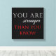 Rappelez-vous ou à un être aimé 'Vous êtes plus fort que vous ne le savez' avec cette impression de toile de motivation audacieuse. Accrochez-le au mur où vous ne pouvez pas le rater. Affichez-le pour que d'autres le voient. Restez motivés. Restez forts. Rejoignez la révolution. Soyez inspirés. Soyez une inspiration. Suivez le blog de Revolution Inspire sur www.revoinspire.wordpress.com.