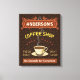 Cette décoration murale rectangulaire en toile enveloppée sur le thème du café s'adresse à tous ceux qui tiennent leur propre café ou qui ont un thème café dans leur décor de cuisine maison. Fait en brun rétro, orange, beige et jaune, ce design inspiré de l'espresso / cappuccino comprend une tasse sur une soucoupe, deux bannières textuelles personnalisées et les mots "Café Shop / Roast frais / Grande Saveur" en jaune. La tasse est bouillante et la bannière supérieure a des tourbillons qui imitent la fumée. Tout repose sur un arrière - plan motif de café foncé. Utilisez les modèles pour ajouter facilement votre nom. Vous pouvez également modifier le bas de la page si vous le souhaitez, qui se lit actuellement : "Aucun motif de plainte". Si vous devez redimensionner le texte pour l'adapter, cliquez sur "Customiser". Prenez une tasse de Joe et admirez vos propres peintures murales personnalisées.