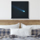 Une comète éblouissante crée une boule brillante et floue dans le ciel nocturne, suivie d'une queue bleue qui se déplace lentement parmi les étoiles dans cette vue stellaire améliorée.
