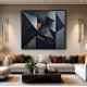 Puissante composition abstraite avec des formes triangulaires superposées en noir profond, gris ardoise et détails dorés. La texture riche de la peinture à l'huile crée de la profondeur et du mouvement. Pièce sophistiquée pour les espaces modernes recherchant un impact visuel et une élégance minimaliste.
