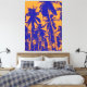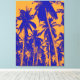 Panneau mur design tropical. Des palmiers abstraits graphiques, audacieux et impressionnants, postérifiés. Bleu et orange.