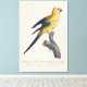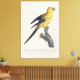 Cette image est une illustration d'histoire naturelle finement détaillée d'un jeune Ara ararauna, historiquement désigné en français sous le nom de « Guarouba dans son jeune âge ». L'œuvre d'art capture l'oiseau perché avec grâce sur une branche texturée, montrant à la fois une précision anatomique et un raffinement esthétique typiques de l'illustration scientifique précoce.
