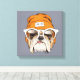 Ce design comporte un portrait de bulldog dans un casquette hipster et avec des lunettes.