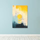 Cette œuvre d'art abstrait minimaliste capture la beauté silencieuse d'un coucher de soleil à travers des textures douces et une composition moderne raffinée. Un cercle doré chaud flotte doucement au-dessus de formes superposées, suggérant le soleil descendant vers l'horizon. Des bleus atténués, des tons de charbon profonds et des blancs crémeux se fondent parfaitement en dessous, créant un contraste paisible avec le ciel jaune lumineux au-dessus.