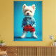 Cette charmante image présente un West Highland White Terrier habillé pour impressionner dans une veste en denim bleu clair, un t-shirt blanc, des shorts rouges vibrants et des baskets blancs. Placé face à un arrière - plan bleu pur, ce pup élégant dégage personnalité et charme, ce qui en fait un site enchanteur et réconfortant pour la mode et les amoureux de les chiens.