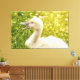 Une photo de fond capture un cygne blanc et moelleux niché dans un lit d'herbe verte. Le bec du cygne est ouvert, révélant un intérieur rose vif, comme s'il était sur le point de chanter ou de crier. Les plumes douces et sombres du cygnet sont éclairées par une lumière chaude et dorée, créant une atmosphère douce et sereine.