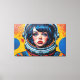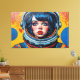 Otis Porritt's digital artwork presents a striking close-up of a woman in an astronaut helmet, rendered with a dynamic Pop Art aesthetic. Her piercing blue eyes and vibrant red lips command attention, while her face is adorned with a pattern of red Ben-Day dots, mimicking comic book printing. Bold black outlines define her features and the contours of the yellow and white helmet. The background, a vivid blue punctuated by graphic bursts and halftone dots, amplifies the energetic, retro-futuristic mood of this captivating portrait.