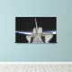 Space Shuttle Discovery qui recoupe la fine ligne de l'atmosphère de la Terre, tandis qu'il est amarré avec la Station spatiale internationale en vedette avec STS-131.