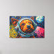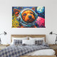 Cette œuvre d'art vibrante présente un gros plan captivant du visage d'un chien, encadré dans la visière claire du casque d'un astronaute. Réalisé avec des coups de pinceau audacieux et texturés dans une palette dynamique d'orangés, de bleus et de rouges, le regard expressif du canidé rencontre le spectateur. L'arrière-plan se déploie en une étendue cosmique stylisée, présentant des planètes lointaines et des formations éparses rappelant des nébuleuses, le tout rendu avec un effet tactile, presque impasto. Le détail complexe de la fourrure et du casque contraste avec les éléments énergiques et abstraits de l'espace environnant, créant une narration visuelle saisissante.