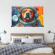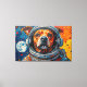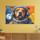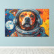 This vibrant artwork presents a captivating close-up of a dog's face, framed within the clear visor of an astronaut's helmet. Rendered with bold, textured strokes in a dynamic palette of oranges, blues, and reds, the canine's expressive gaze meets the viewer. The background unfolds into a stylized cosmic expanse, featuring distant planets and scattered nebulae-like formations, all rendered with a tactile, almost impasto effect. The intricate detailing of the fur and helmet contrasts with the energetic, abstract elements of the surrounding space, creating a striking visual narrative.
