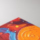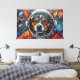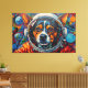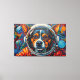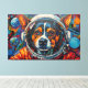 This vibrant artwork presents a captivating close-up of a dog's face, framed within the clear visor of an astronaut's helmet. Rendered with bold, textured strokes in a dynamic palette of oranges, blues, and reds, the canine's expressive gaze meets the viewer. The background unfolds into a stylized cosmic expanse, featuring distant planets and scattered nebulae-like formations, all rendered with a tactile, almost impasto effect. The intricate detailing of the fur and helmet contrasts with the energetic, abstract elements of the surrounding space, creating a striking visual narrative.