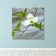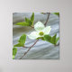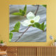 Une photographie de fond montre une fleur délicate de bois de chien du Pacifique avec un centre vert, entouré de feuilles verts et dynamiques. La fleur est positionnée sur une branche brune mince, avec un arrière - plan flou suggérant de l'eau ou une surface molle et neutre. L'image saisit la fraîcheur et la simplicité de la nature, mettant en évidence les détails complexes de la fleur et du feuillage.