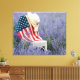 Drapeau américain sur chaise en osier blanc avec casquette dans un champ de sauge russe violet.