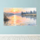 Un paysage serein représentant un plan d'eau calme reflétant un coucher de soleil vibrant. Le tableau présente des tons doux et muets et des touches texturées, créant un sentiment de tranquillité et de paix