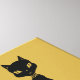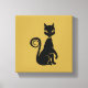 Élégant chat noir posant avec une patte levée. A une mignonne queue bouclée et porte une chaudière fantaisie.