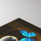 Composition de l'horloge ronde steampunk avec cadran romain noir, décoré avec des engrenages or et laiton, papillons Morpho bleu et lentilles endommagées sur arrière - plan rayé brun. Style Steampunk.