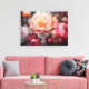 Un gros plan saisissant de pivoines et de roses en fleurs, présentant des pétales fluides dans les tons rose, pêche et blanc contre un arrière - plan sombre. Cette belle oeuvre florale apporte vie et élégance à toutes les chambres.