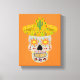 Cette impressionnante impression de toile présente une image graphique d'un crâne inspiré de la Journée mexicaine des morts (Dia de los Muertos). Le crâne est gris pâle et porte un sombrero jaune. Il a des dents d'or et des tournesols mexicains, également appelé Tithonias< au lieu des yeux. Le sombrero a un cactus dessus et est couvert de motifs tourbillonnants et de piments de chili rouge et vert. Le crâne lui-même est recouvert de jolies fleurs colorées de différents types.