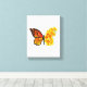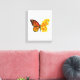 Orange, detailed monarch butterfly with wing decorated with yellow, vibrant California poppy on white background.