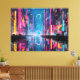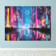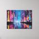 A vibrant cityscape showcases towering buildings adorned with bright neon lights. The reflection in the water adds to the surreal atmosphere.