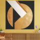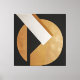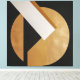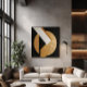 Une composition abstraite fusionnant un cercle doré, un triangle sombre et une bande blanche dans un contraste élégant. L'œuvre transmet un équilibre entre force et subtilité, explorant le dialogue des formes géométriques, de la lumière et de l'ombre, évoquant modernité et sophistication intemporelle.