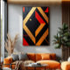 L'abstraction géométrique énergétique ! Diamants et triangles en noir, or et rouge intense, avec des textures ajoutant de la profondeur. Une explosion visuelle mêlant rigueur mathématique et passion chromatique, idéale pour les amateurs d'art moderne à la recherche de contrastes audacieux.