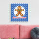 Gingerbread on cookie on a blue white snowflakes background witcaption "Merry Christmas".