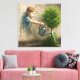 Une peinture murale réaliste représente une jeune fille qui tend la main avec une canette d'arrosage, s'intégrant intelligemment avec un véritable arbre qui pousse contre le mur