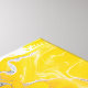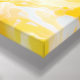 The artwork utilizes expansive areas of pure white to enhance the luminosity of the yellow, while the grey adds depth and sophistication. Scattered splatters and droplets across the surface add texture and maintain the spontaneous, liquid feel of the piece. The overall effect is a highly modern and powerful statement piece that draws inspiration from the current trend of using vibrant accents against neutral tones.