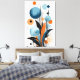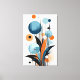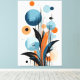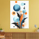 Le tableau est une composition abstraite qui combine des formes géométriques et des formes organiques. Voici les détails : Palette de couleurs : L'oeuvre présente des tons bleu, orange, beige et noir. Formes : Plusieurs cercles se chevauchant de tailles différentes créent une profondeur. Certains cercles sont solides, d'autres sont transparents ou à motifs (avec des points ou des lignes). Eléments organiques : Les formes stylisées en plante dans les tons orange et bleu ajoutent du dynamisme à la composition. Accents lunaires : De petits points noirs et des figures étoilées sont éparpillés partout, donnant au tableau une touche ludique. Esthétique : Le mélange de géométrie et de formes organiques donne lieu à une esthétique moderne et propre que les invitations interprètent.