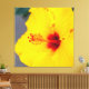 Une photo de fond capture les détails complexes d'une fleur d'hibiscus jaune vibrante. Les pétales de la fleur sont doux et délicats, avec une texture légèrement feutrée. Le centre de la fleur est un rouge profond, qui contraste magnifiquement avec le jaune vif. L'étamine de la fleur, un amas de filaments dorés fins, s'étend du centre, ajoutant à la beauté complexe de la fleur.