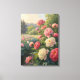 Enchanting garden path lined with purple and blue hydrangeas in golden sunlight. Peaceful, romantic landscape art perfect for cottage, country, or traditional garden-inspired decor.