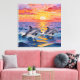 An ai impasto style dolphins swimming with a pink, orange and purple sunset over the ocean . A beautiful coastal wall art piece for your beach home or beachy styled home.