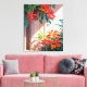 Illustration botanique dynamique et sereine, avec des plantes tropicaux luxuriants et des feuilles rouge-orange baignés par une lumière chaude du soleil. Les ombres douces et l'arrière - plan moderne de l'entrée créent une atmosphère calme et estivale. Idéal pour les amateurs d'art d'inspiration nature, de design tropical minimal et de décoration chaleureuse.