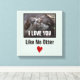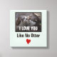 Un imprimé en toile avec une photo mignonne et romantique avec 2 loutres en amour. Une loutre lèche et embrasse le petit visage de l'autre loutre, les yeux fermés à l'air heureux. Le texte dit "Je t'aime comme pas de loutre" avec un coeur de gribouillis rouge. Placez-vous sur un arrière - plan vert clair.